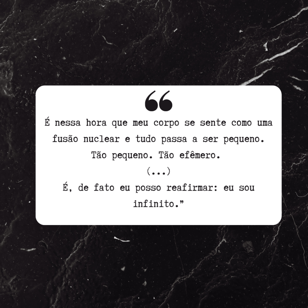 Hoje eu cheguei em casa super cansado, deitei e coloquei minha playlist. Não a nossa, a minha mesmo. E fiquei deitado escutando, prestando atenção nas letras que já sei de cor, sentindo os cheiros da memória. São tantas memórias guardadas em uma mente em expansão. Acho que é por isso que eu sempre digo que eu sou infinito, porque, por alguns instantes, deitado, com os olhos fechados ou não, escutando algumas canções que por vezes ficam repetindo, eu sinto como se meu corpo e minha mente se expandissem e tomassem conta de tudo ao meu redor. Todos os sentidos se apuram e eu me sinto mais parte do todo do que jamais senti. Nesses momentos eu tenho a certeza de que eu sou infinito. De que realmente tenho a centelha divina dentro de mim, que compartilho com todos os outros seres vivos. É nessa hora que meu corpo se sente como uma fusão nuclear e tudo passa a ser pequeno. Tão pequeno. Tão efêmero. E eu ali, deitado, ocupando um espaço que vai muito além do meu corpo. É, de fato eu posso reafirmar: eu sou infinito. Todos somos, só não descobrimos isso ainda.