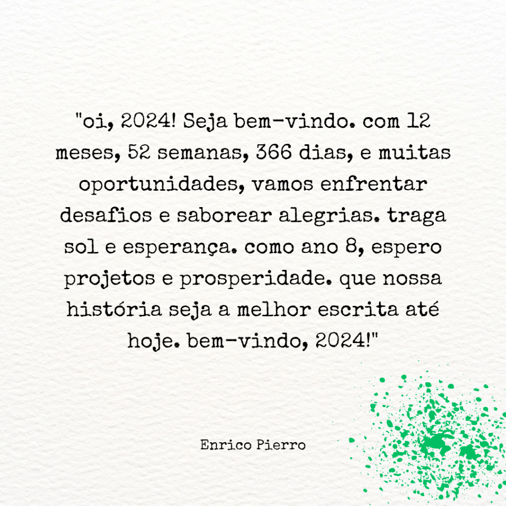você é um ano 8, dizem que isso é bom. projetos, prosperidade, coisas boas no horizonte. eu torço por você. e te prometo acordar todos os dias te agradecendo. eu sei que perdi muitas oportunidades em 2023, mas veja só, eu também plantei muita coisa boa. então que você seja o ano pra eu colher. pra todos nós colhermos as nossas atitudes e escolhas do ano que deixamos para trás. e se não tivemos muito tempo de plantar, está tudo bem, ainda temos essa infinidade de horas vindo. 366 páginas em branco. todo um ano novinho em folha.