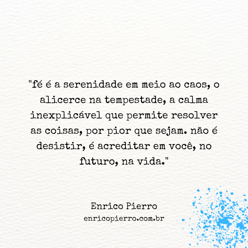 acreditar ou mesmo ter fé, não é viver na inércia. não é sentar e esperar. é perseverar e continuar, mas acreditando que deus sempre cuidou de mim e vai seguir cuidando. acho que no fundo, a fé, é a antítese do desespero. é a serenidade em meio ao caos. é o alicerce na tempestade. é a calma inexplicável que faz com que você tenha a cabeça no lugar par conseguir resolver as coisas, por pior que elas sejam. fé é acreditar. em você, no futuro, na vida. fé é não desistir.