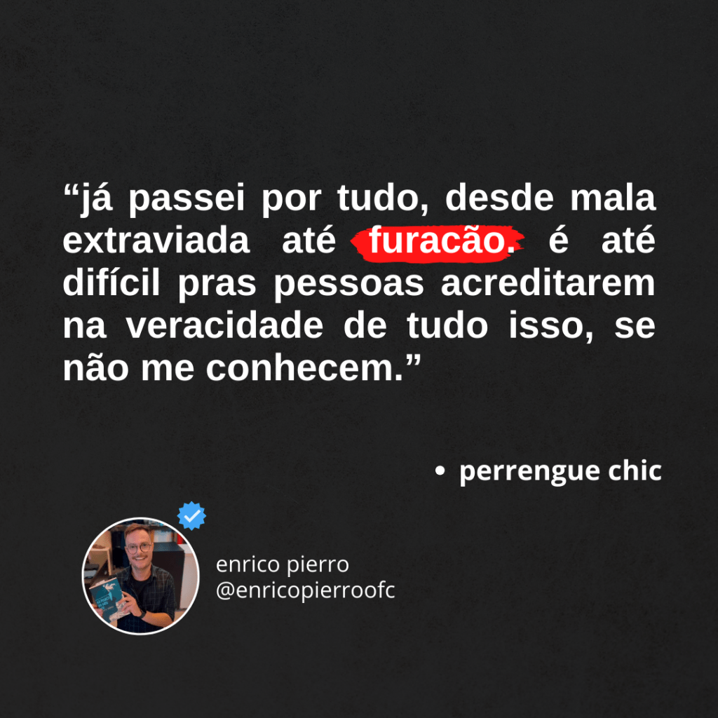 e eu falo emoção com propriedade. já passei por tudo, desde mala extraviada até furacão. é até difícil pras pessoas acreditarem na veracidade de tudo isso, se não me conhecem. e mesmo o espaço aqui sendo bem reduzido, eu vou tentar resumir pra vocês: