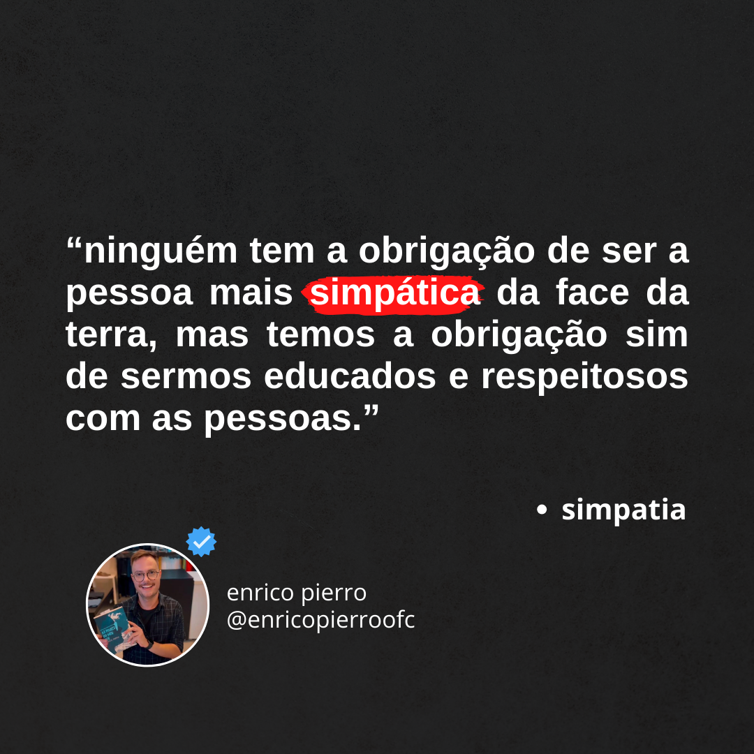 ninguém tem a obrigação de ser a pessoa mais simpática da face da terra, mas temos a obrigação sim de sermos educados e respeitosos com as pessoas. em especial a todas as pessoas que, de alguma forma, nos servem. porque no final das contas, ninguém, absolutamente ninguém é melhor do que ninguém. diploma não é caráter. e simpatia é de graça e eu tenho certeza de que quanto mais você exercitar isso (mas tem que ser de coração, pelo amor, não pode ser forçado se não fica falso e não adianta nada), mais você vai ver como a sua vida se transforma. sorrisos são como um farol de alegria no meio das piores tempestades.