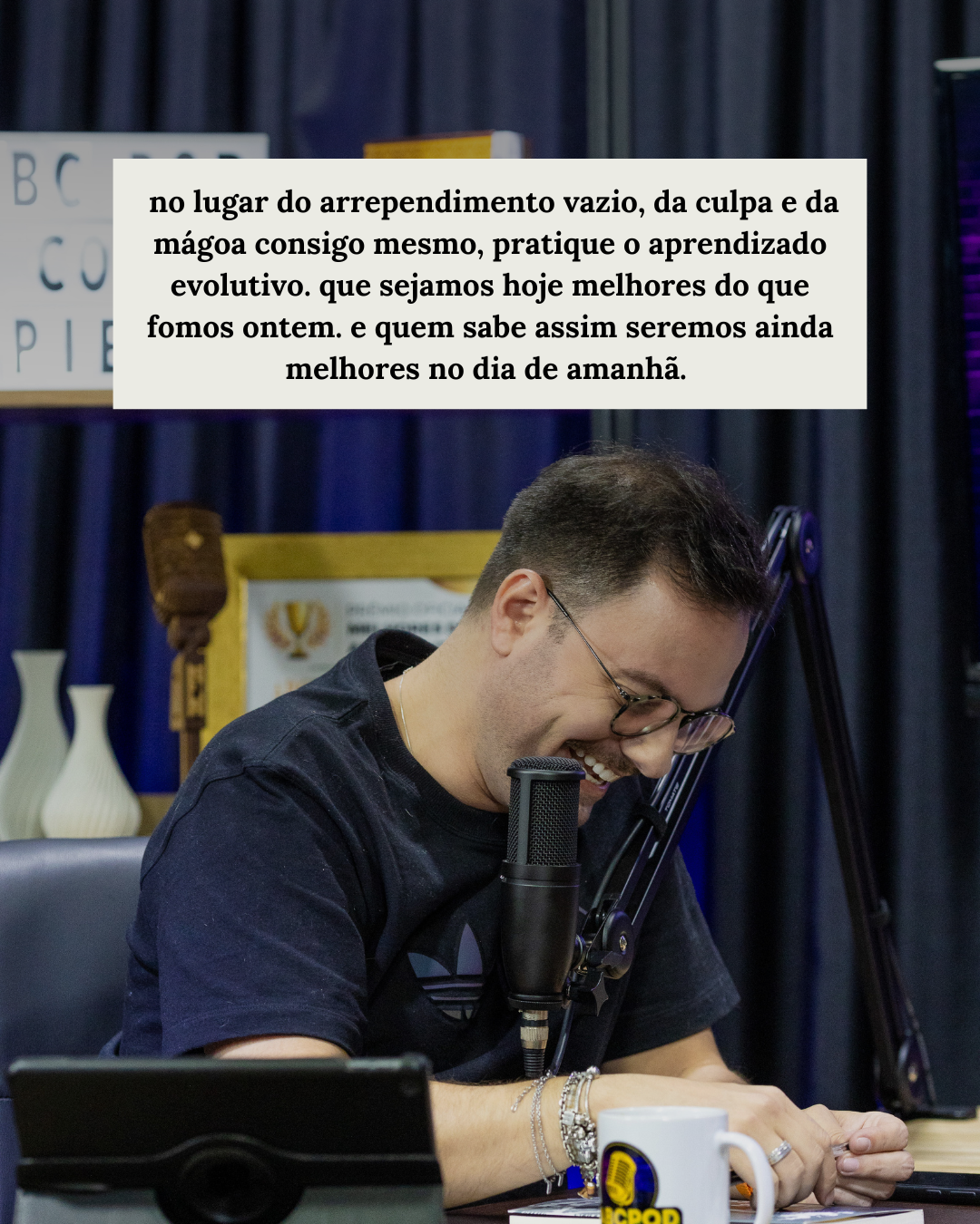 é preciso aceitar que estamos em constante evolução e crescimento ao longo do tempo (até porque se hoje eu consigo olhar pra trás e reprovar algumas atitudes minhas, significa que algo mudou, não é mesmo?). então tente fazer isso. aprenda com os teus erros para que você não os repita mais e aceite que você tem o direito de errar. mas tem a obrigação de se desculpar e tentar ser melhor. no lugar do arrependimento vazio, da culpa e da mágoa consigo mesmo, pratique o aprendizado evolutivo. que sejamos hoje melhores do que fomos ontem. e quem sabe assim seremos ainda melhores no dia de amanhã.