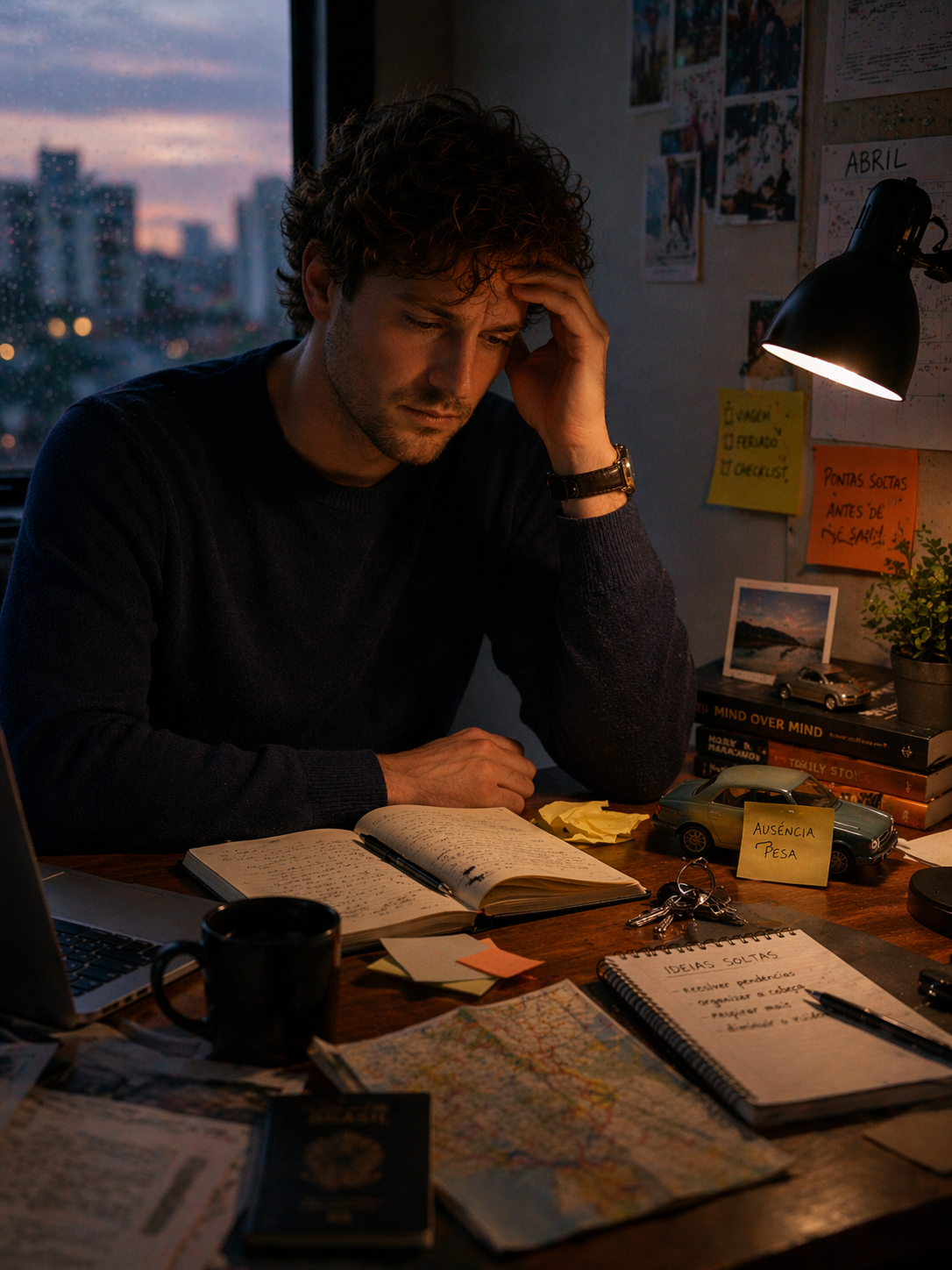 o feriado estava chegando, e isso deveria trazer algum tipo de alívio. uma pausa, um respiro, uma chance de sair um pouco do ritmo que vem me desgastando. só que, junto com essa ideia de descanso, veio um pacote inteiro de coisas que eu não queria sentir. viagem, pra mim, nunca é só viagem. vem ansiedade, vem um aperto estranho, uma sensação de que tem alguma coisa que eu não vou dar conta, que eu não vou conseguir resolver tudo antes de sair, que eu estou deixando pontas soltas demais. é como se eu nunca conseguisse simplesmente ir. eu sempre levo um peso junto. e a cada segundo que passa eu sinto que estou a um passo mais perto de desistir.