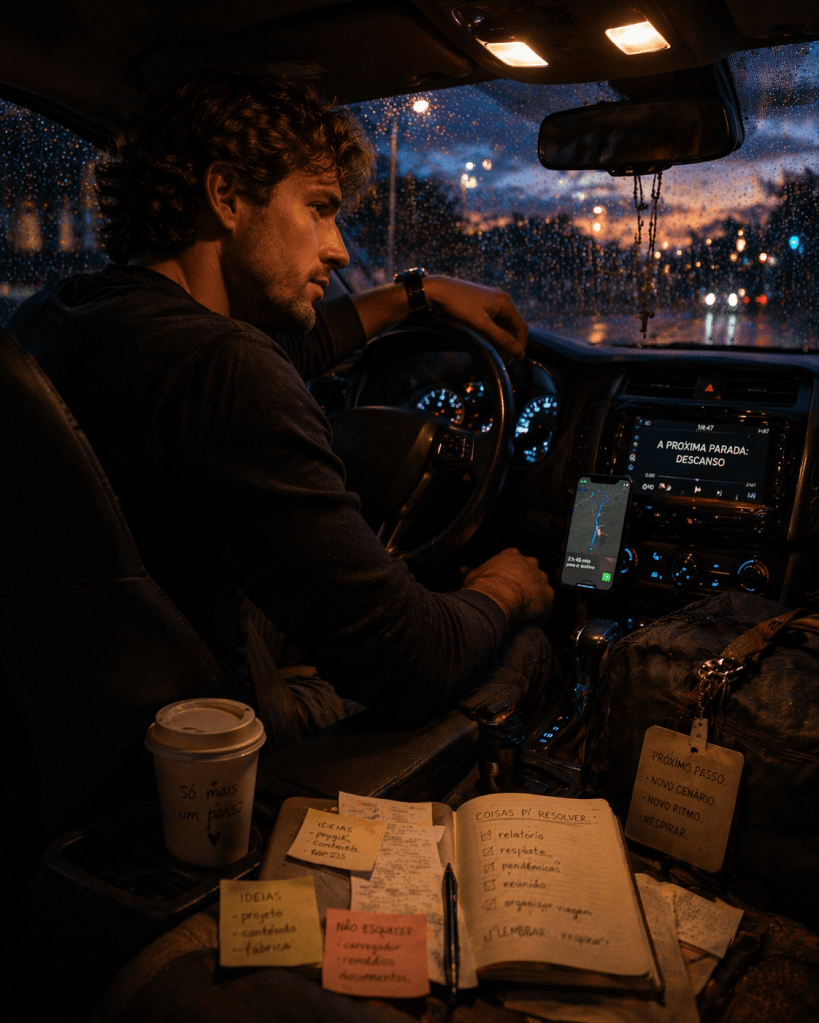 e aí, pela primeira vez no dia, o pensamento não veio pra complicar, veio pra aliviar. eu sabia que, no momento em que eu entrasse no carro, alguma coisa ia mudar. não os problemas, não a realidade, não tudo de uma vez. mas a forma como eu ia sentir aquilo. como se existisse um limite entre o agora e o depois, e esse limite fosse só dar a partida.