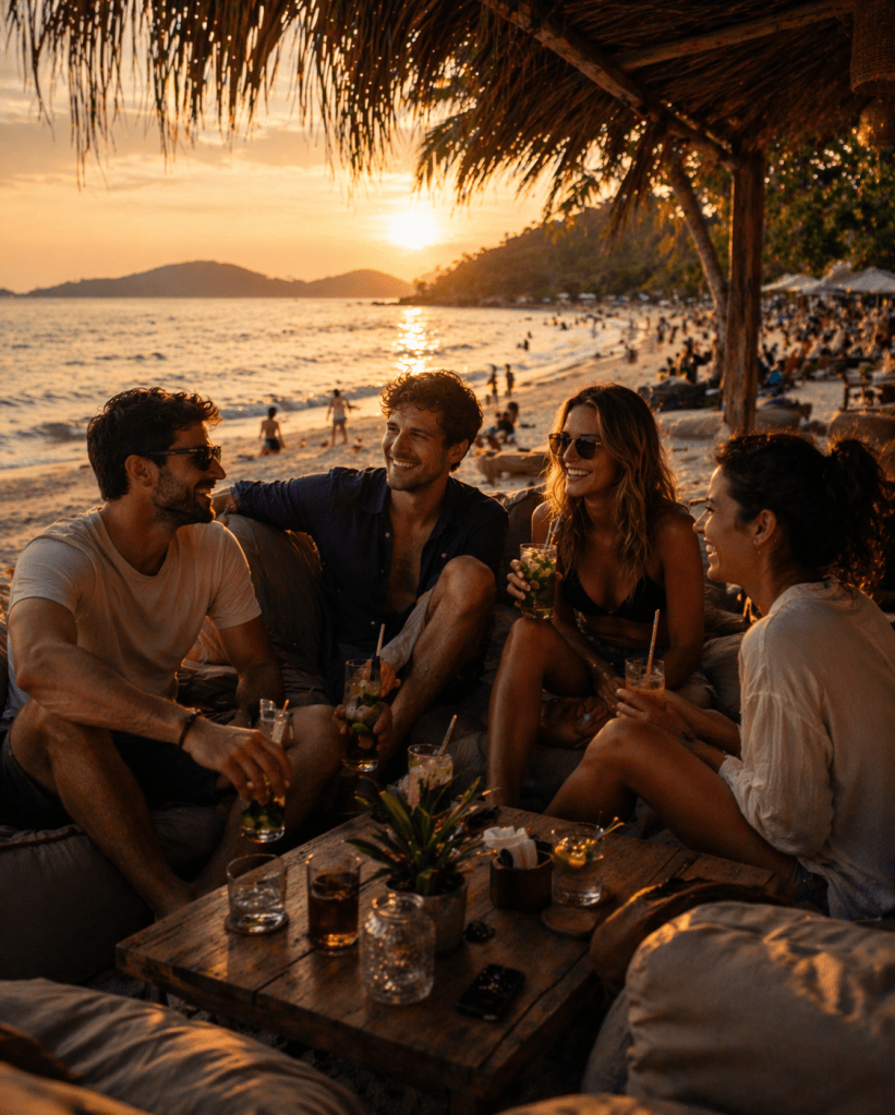 a gente chegou cedo e escolheu um lugar pra ficar. um bar pé na areia, desses que não pedem pressa. pegamos umas poltronas mais confortáveis, quase um lounge improvisado, e ali a gente ficou. entre uma conversa e outra, entre risadas que vinham fácil, sem esforço, a gente foi deixando o dia acontecer. sem roteiro, sem obrigação, sem aquela necessidade constante de fazer alguma coisa produtiva com o tempo. a gente só deixou o dia existir. e, sem perceber, as horas foram passando de um jeito diferente. não arrastado, não corrido. só… no tempo certo.